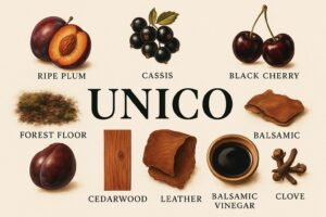 ウニコの味わいは、濃いガーネット色をしており、熟れたプラムやカシス、ブラックチェリーといった黒系果実の濃密なアロマが特徴です。