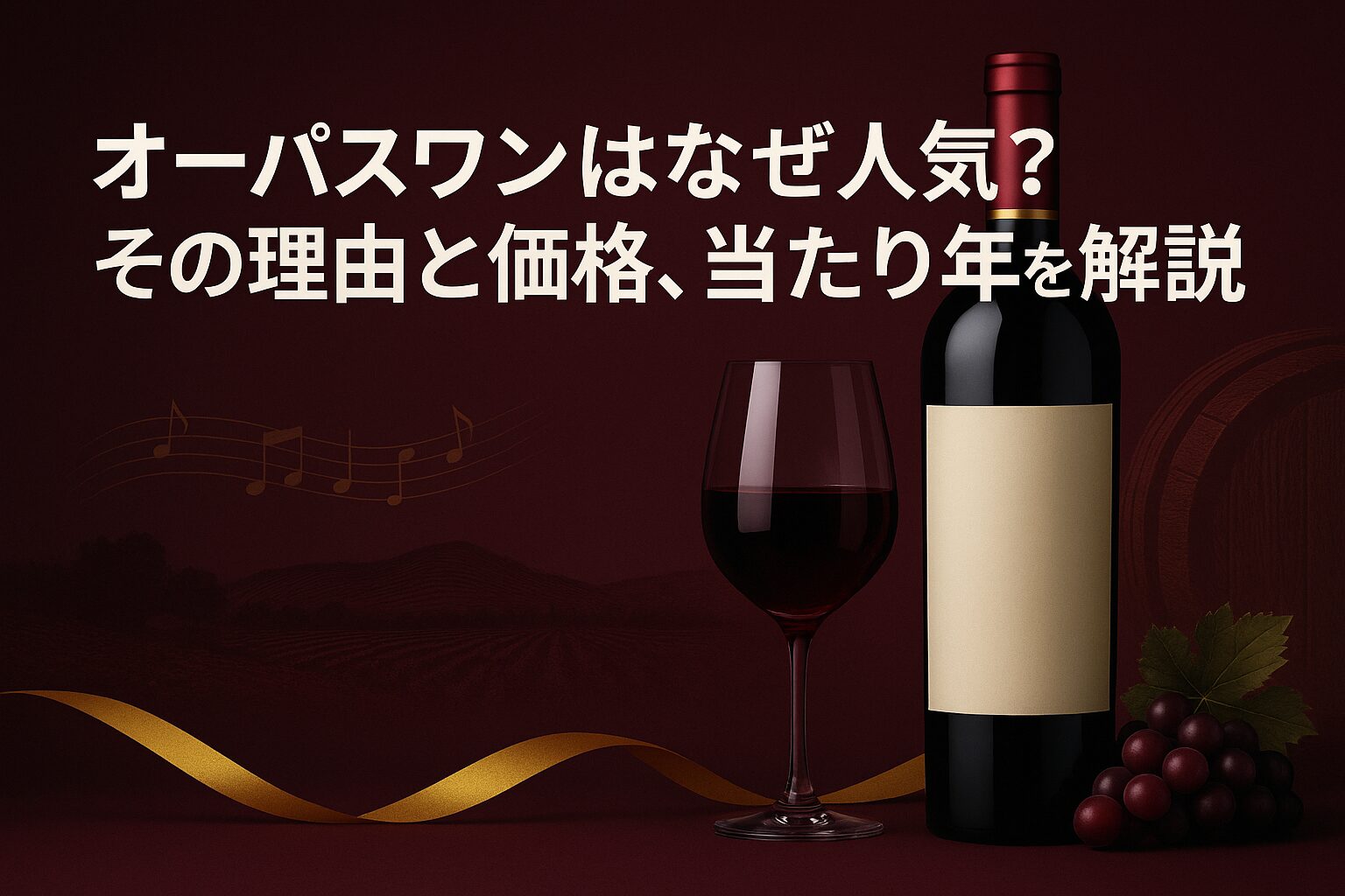 この記事では、オーパスワンが「どんなワイン?」という基本的な情報から、その芳醇な味や「飲みやすい?」といった素朴な疑問、さらには「なぜ高いのか」という価格の背景まで、あらゆる角度から人気の秘密に迫ります。